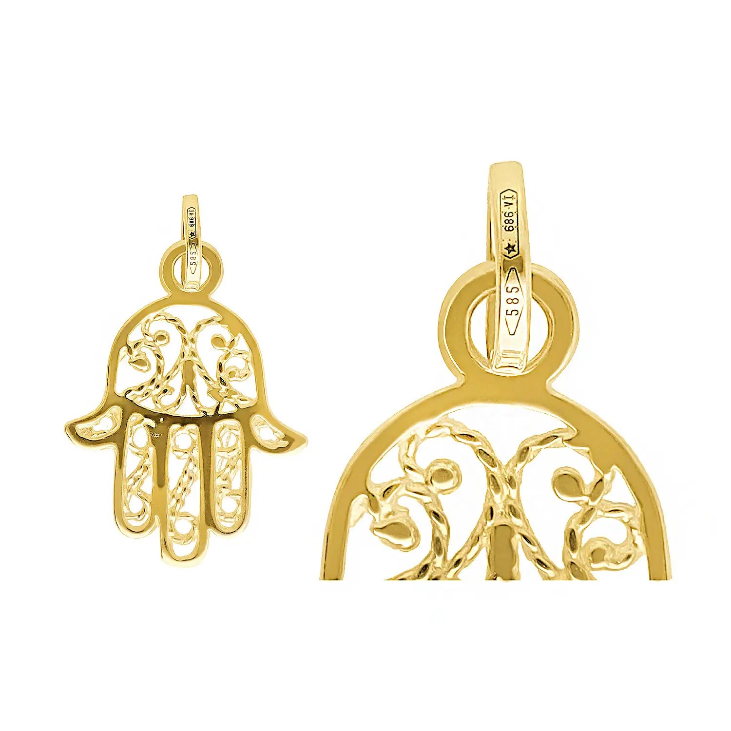 Charm Mano di Fatima in oro giallo 585/14k realizzato a mano dagli artigiani orafi di Forme di Lucchetta con l’antica tecnica della fusione a cera persa. Circondati di energia positiva con il ciondolo portafortuna Mano di Fatima o fai un regalo per augurare fortuna, ricchezza e gioia. Chiamata anche Hamsa o Mano di Alo, la Mano di Fatima è un amuleto antico e ricco di significati e che vuole comunicare protezione, impegno, fedeltà, fortuna e legami forti.