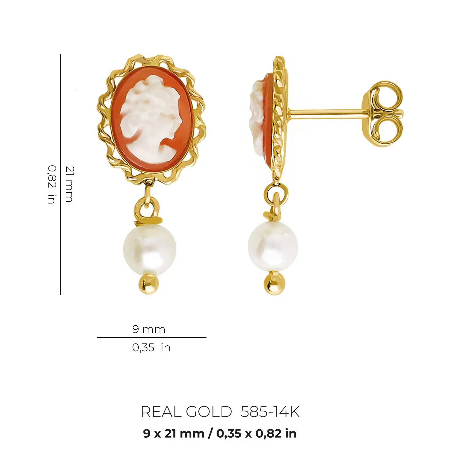 Orecchini pendenti in oro giallo 14 carati con cammeo e perla di fiume. Ogni gioiello custodisce un cammeo artigianale in conchiglia naturale, finemente inciso a mano con l’iconico profilo femminile. La montatura in oro 585-14 carati, caratterizzata da una cornice elaborata e ritorta, esalta la forma ovale del cammeo.